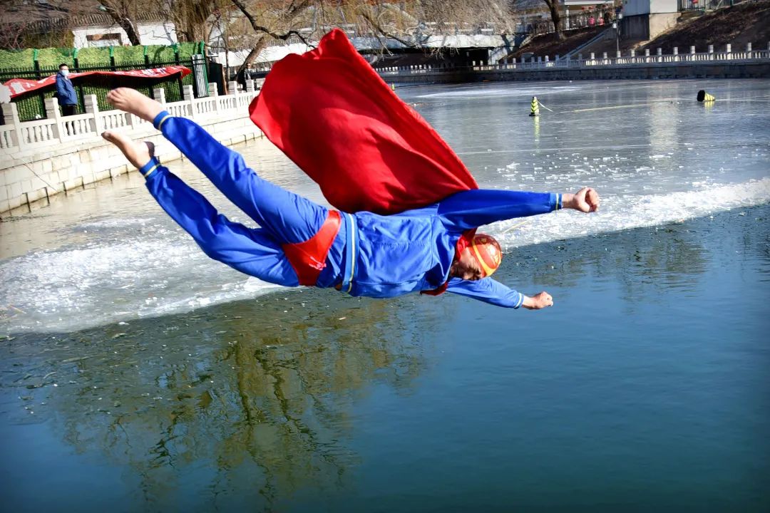 "冬泳超人 2021年2月7日,北京八一湖,一名冬泳爱好者装扮成超人模样,纵身跳入冰冷的湖水中。