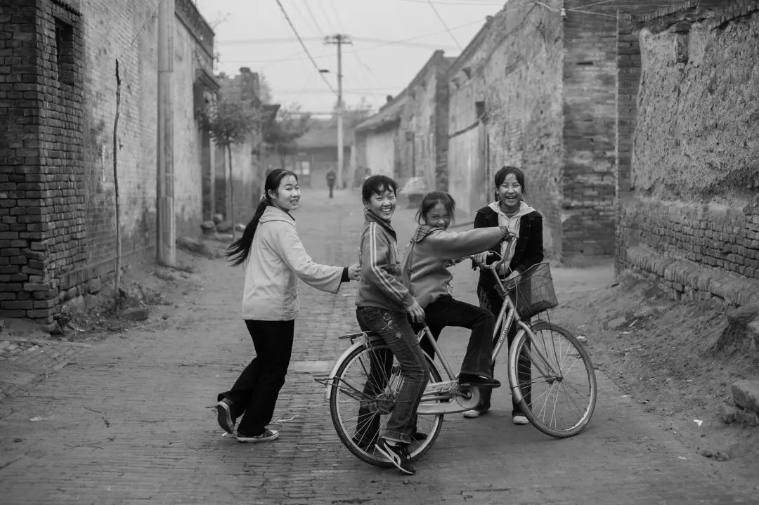"2009年10月,平遥古城,街头骑车玩耍的女孩们。