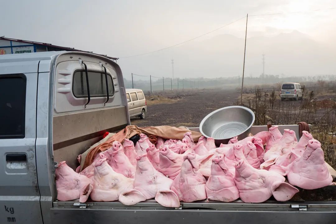 "2017年,浙江丽水,集市货车上出售的猪头。