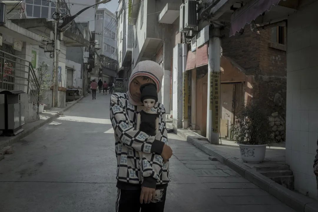 "2021年2月23日,拍摄于个旧鄢棚城中村。一个小女孩站在街上,怀里抱着她的洋娃娃。