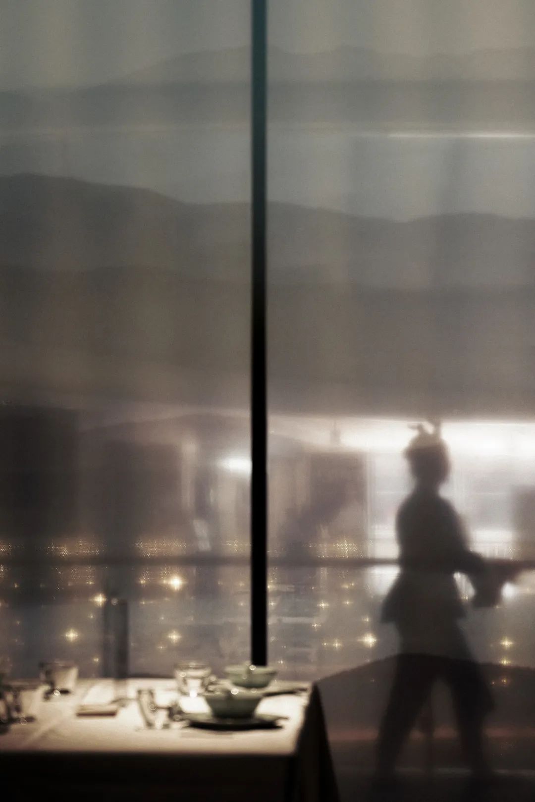 "2020年摄于深圳,餐厅屏风外走过一位穿着制服的服务员。