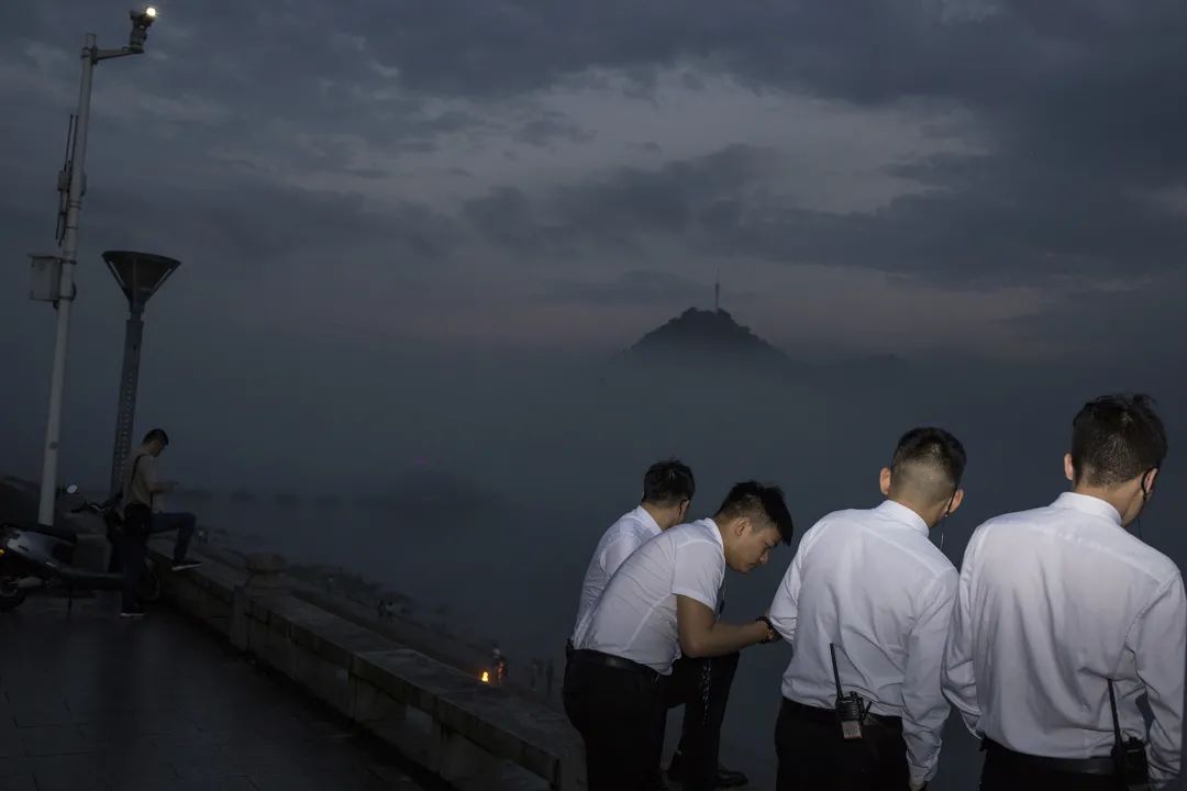 "2021年5月,湖北宜昌,几个身着工装的帅哥在长江边欣赏江景暮色。