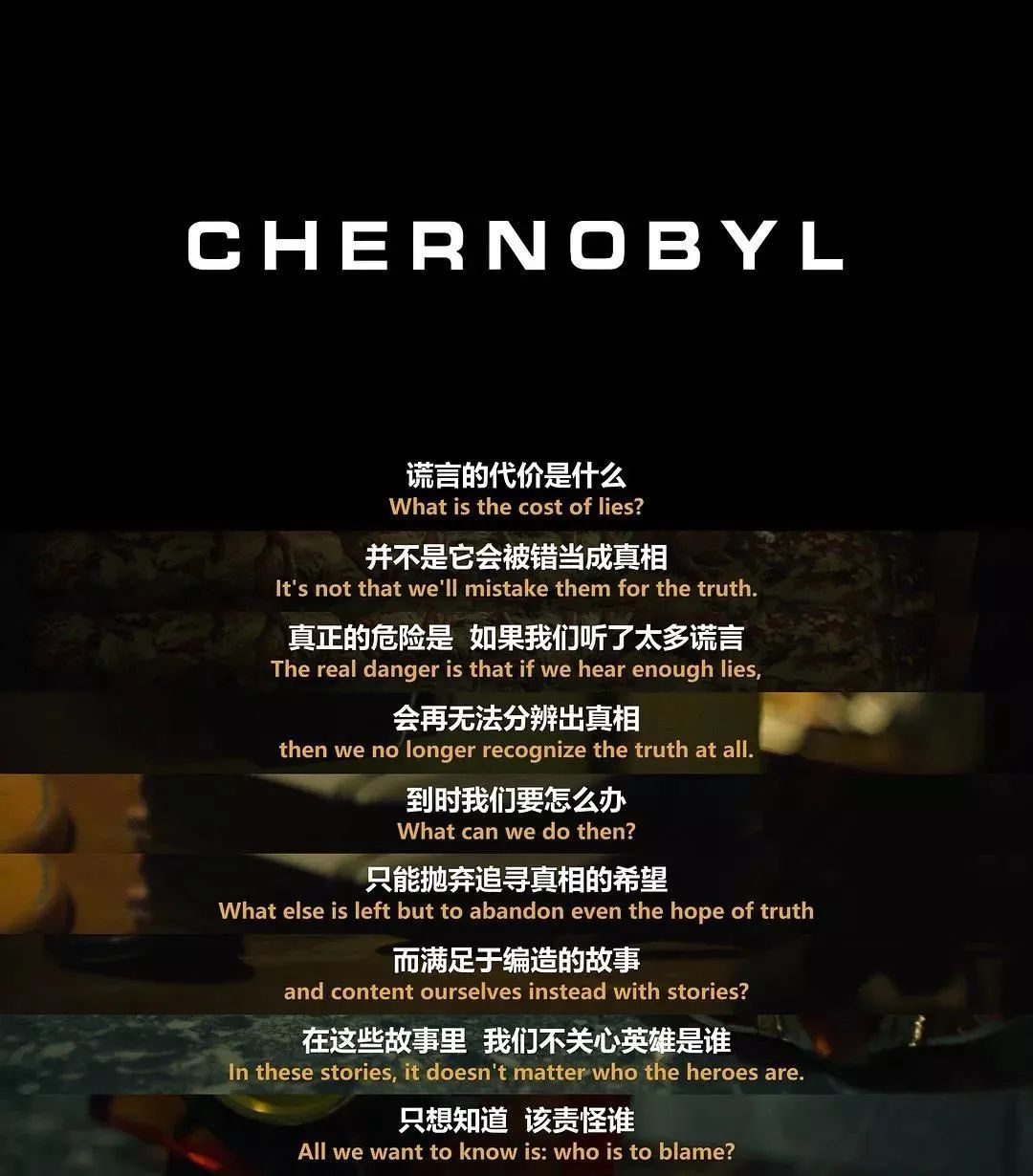 《切尔诺贝利》看似和我们当下疫情并不直接相关,但其灾难的广泛关联性和现实参考意义却令人震动,其中的经典台词也是社交媒体上被引用率超高的文字。