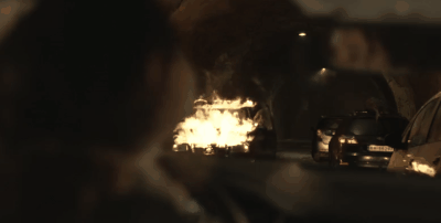为了躲避浓烟,有人开着起火的车向后行驶。