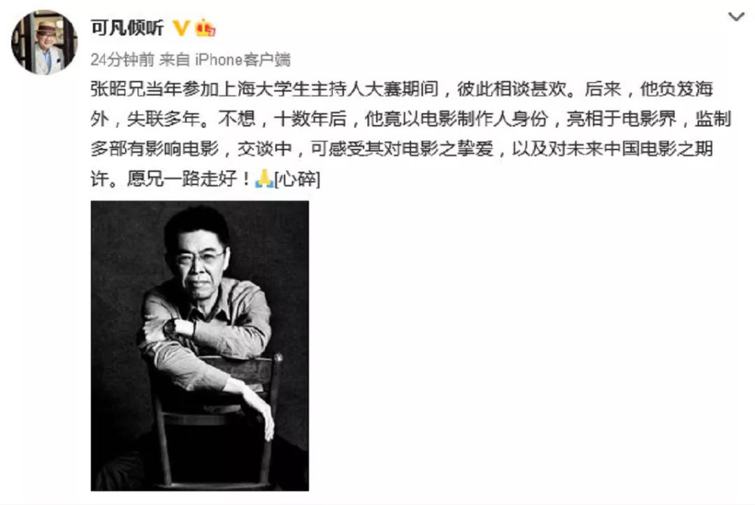 好友曹可凡也有发文,称在张昭参加上海大学生主持人大赛期间,他们就彼此甚欢,等数十年再见,他竟然已是电影制作人身份,亮相电影界,在交谈之中,能感受到他对电影的挚爱。
