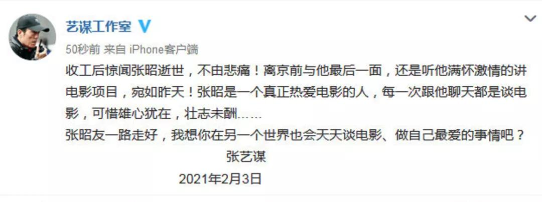" 张艺谋则通过工作室发文悼念,表示离京前与他最后一面,还是听他满怀激情地讲电影项目,张昭是一个真正热爱电影的人,希望他在另外一个世界,也会天天谈电影。