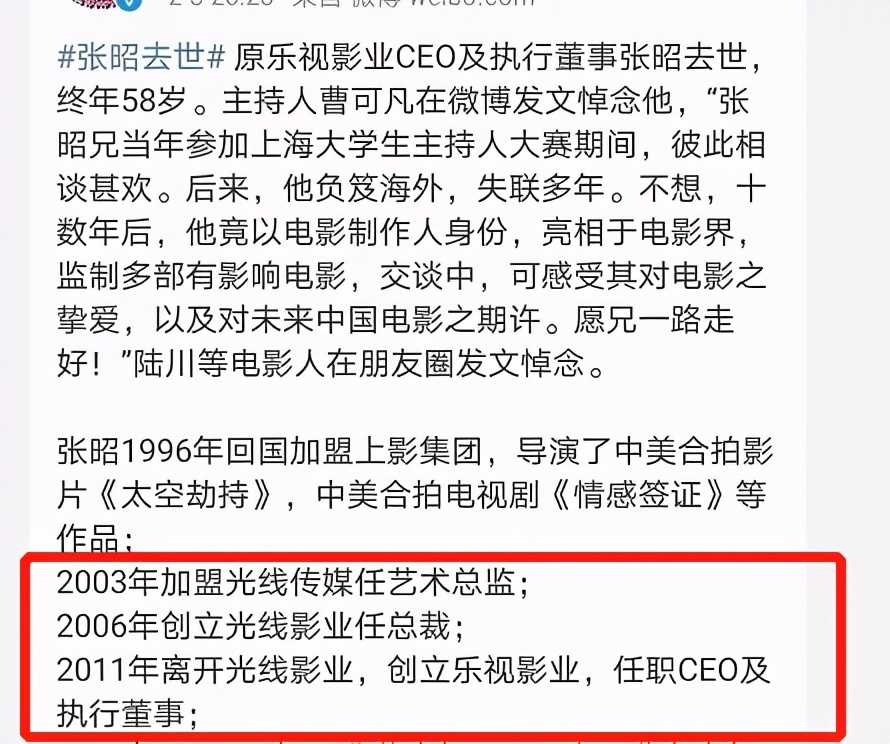 继下午知名音乐人赵英俊去世后,晚上,有业内人士称,原乐视影业ceo,圈内知名制作人张昭也不幸离世,享年58岁。