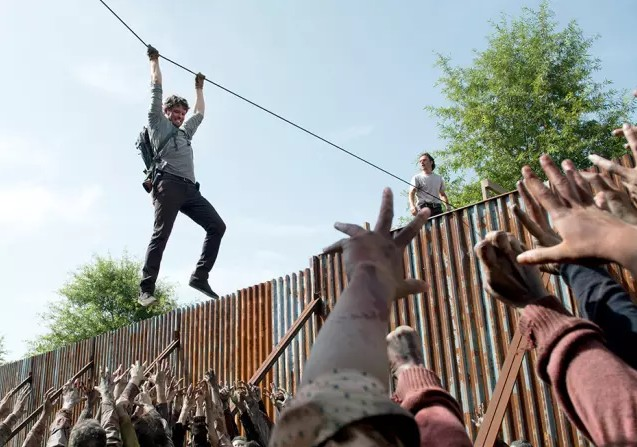 尼古拉斯在格伦面前开枪打爆了自己的脑袋,尸体压倒了格伦,两个人掉入了丧尸群中。当丧尸拉出内脏大快朵颐时,格伦无助的尖叫让人心碎。整个场景充满了悲壮,震撼人心,可在为格伦惋惜了几周后,格伦竟然神奇的没死,妈的f***,导演你在耍猴吗