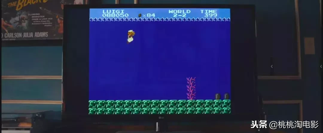 电视机里播放的影像还有游戏《超级玛丽》的片段,熟悉游戏的人都知道,这属于隐藏关卡,也暗示山姆在流行文化的隐藏信息中找寻答案。