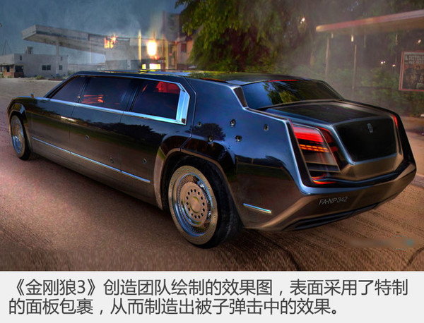 《金刚狼3》的汽车创作团队设计师nick pugh透露,对于这台道具车的外形设计有很多要求,比如,虽然时间是2029年,但是金刚狼这台克莱斯勒limo已经开了五年,而且他为了隐姓埋名,开太过炫目的车则不符合常理,因此他需要一台超前、符合当时时代设定、外观又简单低调的车。