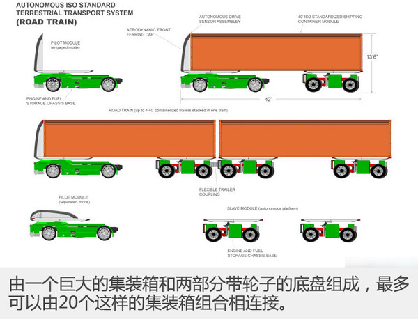 《金刚狼3》里自动驾驶卡车的结构是由一个巨大的集装箱和两部分带轮子的底盘组成,最多可以由20个这样的集装箱组合相连接。