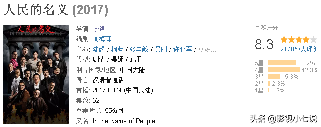 top03:《人民的名义》,豆瓣评分8.3,52集,腾讯视频、爱奇艺视频、芒果tv、搜狐视频、优酷视频、pp视频均可观看。
