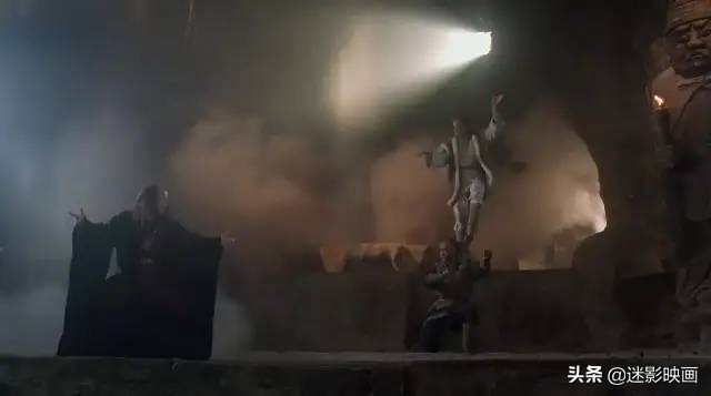 相较于略显单薄的主角方世玉和洪熙官两位少林弟子,电影中花费最多精力塑造的反而是大反派神公。此公不但神功无敌,而且残暴无常,不高兴时随手取掉身边婢女的头颅,时常大笔挥绘画鬼图,嚣张写就“佛已乐在地狱”大字,更像是一个被权力和欲望扭曲的恶魔。