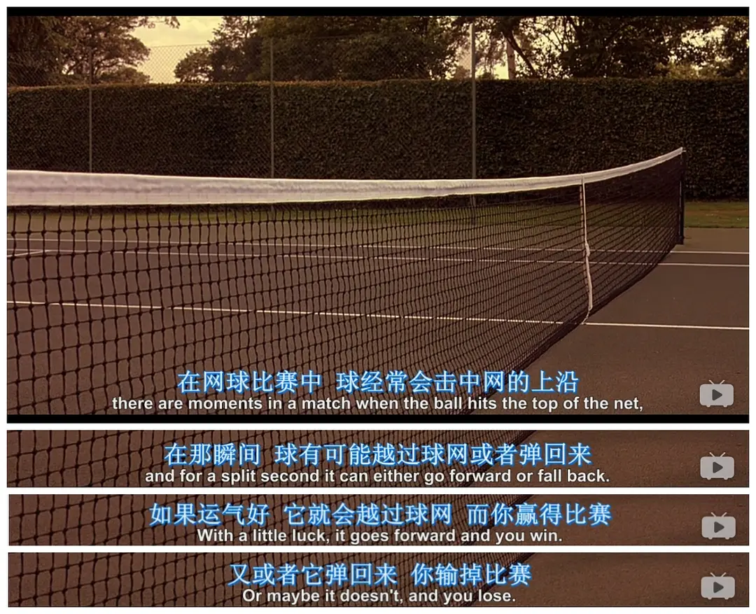 电影一开始男主角克里斯通过旁白说道:“在比赛中,有时候球会触网,那一刻它可能飞过球网,但也有可能落到你这一边。如果运气好,球飞过去了,你将取得胜利,如果没有那么你就输了。”克里斯深谙人生就如同一场网球赛,家庭出身不同,每个人的起点也不一样,网球对于上层阶级只是一种消遣,但是对于克里斯来说这是他实现阶级跨越的工具。他放弃成为一名网球职业选手,来到伦敦成为一名高级俱乐部的网球教练,就此结识到富家女克罗伊,并借此步入上流社会。