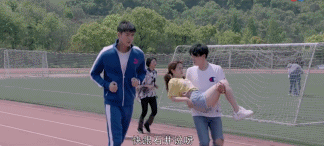 女主腿短跨不过栅栏,男主屁颠颠的把她抱过来。