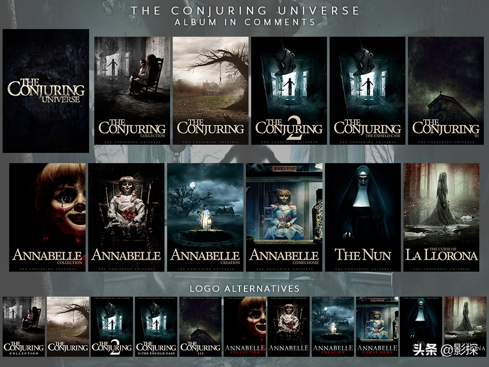 《修女》(1952年)→《安娜贝尔2:诞生》(1955年)→《安娜贝尔1》(1967年)→《安娜贝尔:回家》(1968年)→《招魂》(1971 年)→《招魂2》(1972年)→《哭泣女人的诅咒》(1973年)→《招魂3》(1981年)→《驼背人》(时间点尚未知)
